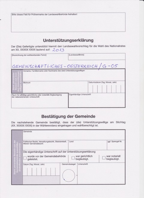 Hier ist ein Beispiel für eine Unterstützungserklärung für die österreichische Nationalratswahl 2013. Das Formular kann man unter folgender Adresse herunterladen.